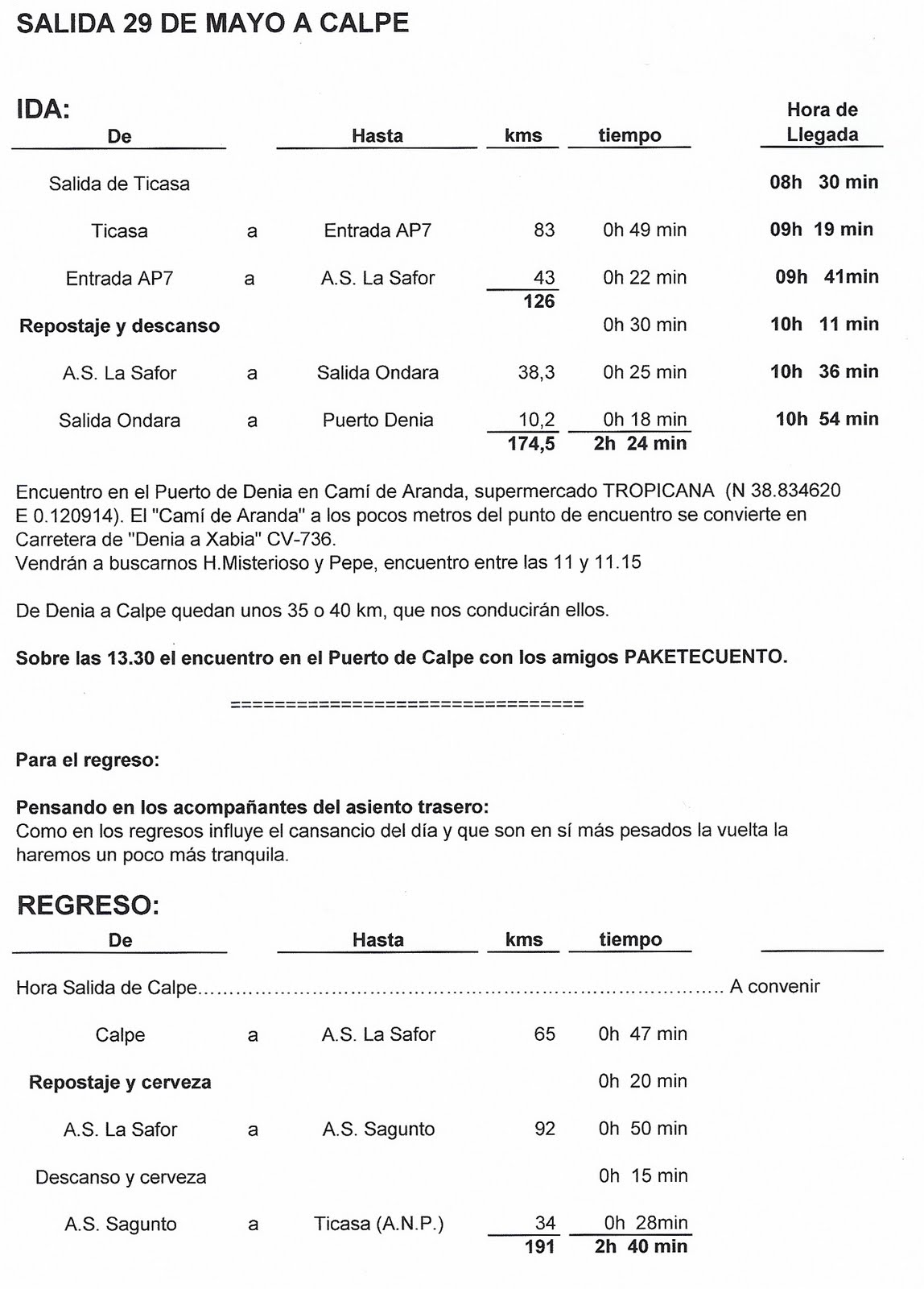 Al final de este escrito pongo el Planning de la ruta de ida y de la vuelta. Se ruega máxima puntualidad. A las 8,30 se saldrá de Ticasa con los depósitos llenos. Si alguien piensa llenar combustible en Ticasa que llegue antes para repostar, repito la salida será a las 8.30 en punto. Llevaremos la moto de cabeza, que para esta salida me han elegido a mí, dos motos rápidas haciendo de motos de apoyo que serán Eduardo como moto de cola que cerrará el grupo, y Mirage como moto de apoyo que irá en el centro del grupo. Un par de coches vendrán detrás de todos protegiendo la cola del grupo. El grupo consta de más de 30 motos, entre los de Castellón y los de Valencia.