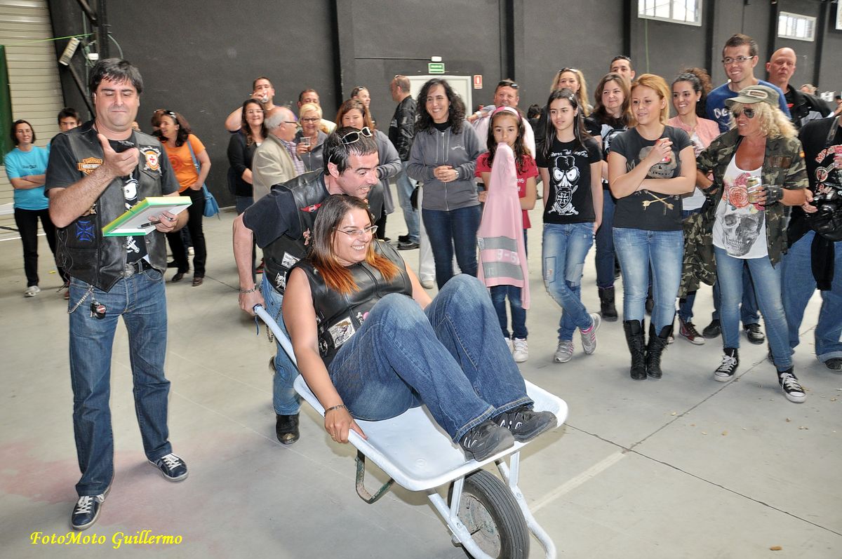 Se procedió a los juegos moteros. uno de ellos fue el lanzamiento de chasis que también veréis en las fotos, con participación masculina y femenina. En el interior de la nave hubo otro juego consistente en transportar por un circuito marcado a otra persona montada en una carretilla de mano, resultando ganadora la pareja que hiciese el recorrido en menos tiempo.